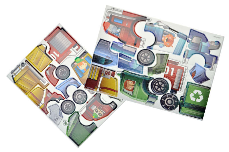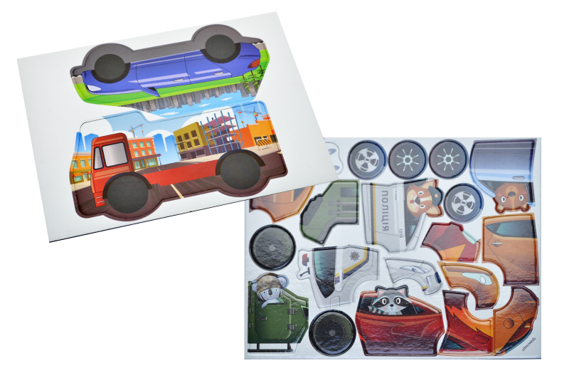 The set includes 48 magnets, 2 magnetic boards and a booklet with tasks. Children can attach magnets to a board or refrigerator, inventing their own stories and adventures where vehicles are the main characters.