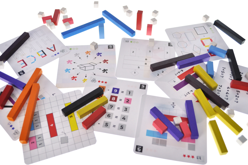 The set consists of 56 wooden sticks of 10 different colors with a section of 10x10 mm, which differ in length and color. Sticks of the same length are made in one color. The longer the stick, the greater the numerical value it expresses. The smallest stick ("one") 10 mm long represents the number 1, each subsequent one is 10 mm longer and represents the next ordinal number: pink - number 2 (20 mm), blue - number 3 (30 mm), etc.