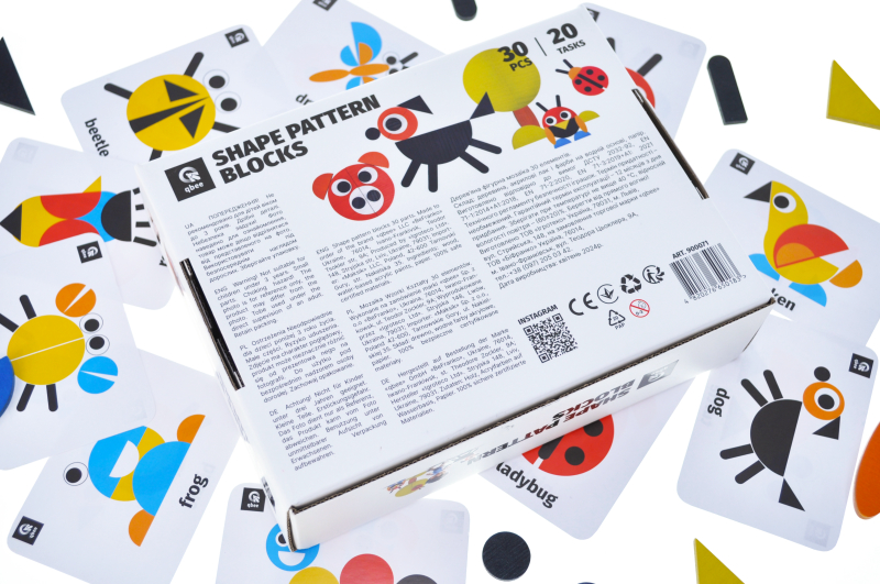 Colored shaped wooden mosaic from TM qbee consists of 30 elements, from which you can lay out stylized images of animals, plants, household items, numbers and letters, geometric shapes, ornaments.