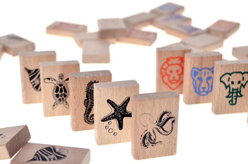 The set consists of two sets of chips of different themes: black - sea creatures, colored - wild animals.