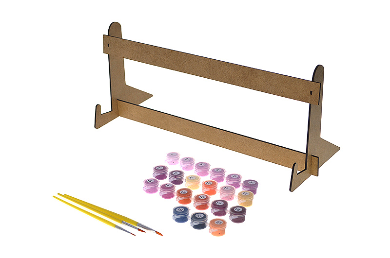 The paint-by-numbers set (painting by numbers) consists of a primed art canvas on a stretcher, a set of high-quality acrylic paints resistant to abrasion and burning, volume 2.5ml ± 9% each, nylon brushes of different sizes, a wooden stand and a control sheet.