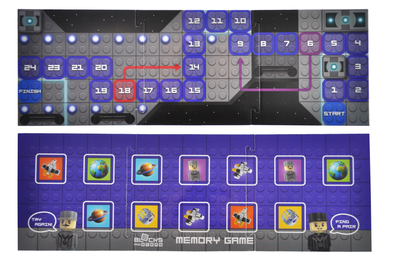 The "Blocs&Steps" series from qbee is not only about the constructor. In this series, in addition to blocks, you get a themed walking game and a memory game.